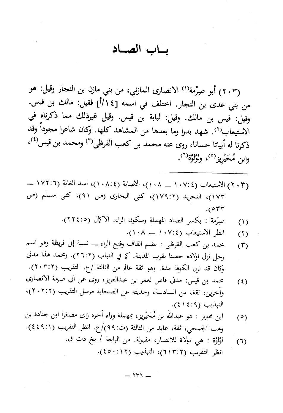 203 - أبو صِرْمة (¬1) الأنصارى المازنى، من بنى مازن بن النجار وقيل: هو من بنى عدى بن النجار. اختلف في اسمه فقيل: مالك بن قيس. وقيل: قيس بن مالك. وقيل: لبابة بن قيس. وقيل غير ذلك مما ذكرناه في الاستيعاب (¬2). شهد بدرا وما بعدها من المشاهد كلها. وكان شاعرًا مجودًا وقد ذكرنا له أبياتا حسانا، روى عنه محمد بن كعب القرظى (¬3) ومحمد بن قيس (¬4)، وابن مُحَيْرِيز (¬5)، ولؤلؤة (¬6).