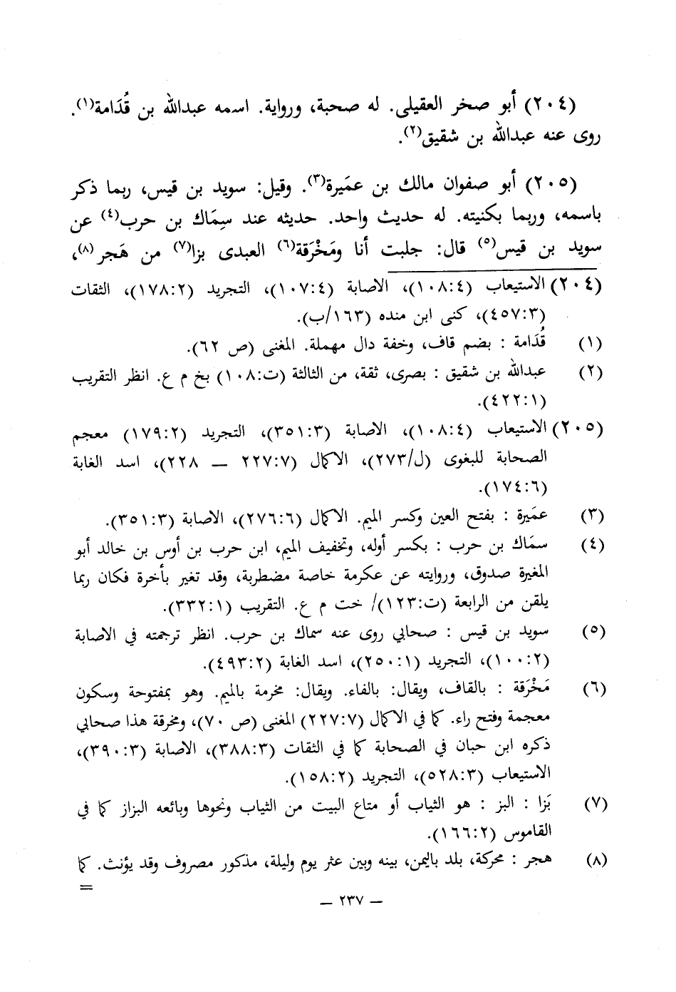204 - الاستيعاب (4: 108)، الإصابة (4: 107)، التجريد (2: 178)، الثقات (3: 457)، كنى ابن منده (163/ ب).