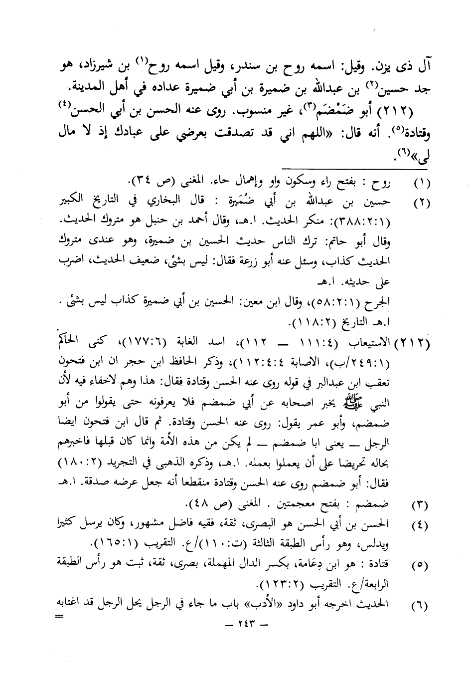 212 - أبو ضَمْضَم (¬3)، غير منسوب. روى عنه الحسن بن أبى الحسن (¬4) وقتادة (¬5). أنه قال: "اللهم انى قد تصدقت بعرضى على عبادك إذ لا مال لى" (¬6).