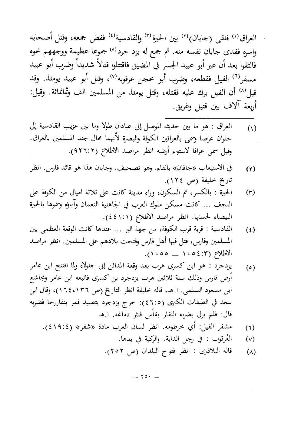 العراق (¬1) فلقى (جابان) (¬2) بين الحيرة (¬3) والقادسية (¬4) ففض جمعه، وقتل أصحابه وأسره ففدى جابان نفسه منه. ثم جمع له يزد جرد (¬5) جموعا عظيمة ووجههم نحوه فالتقوا بعد أن عبر أبو عبيد الجسر في المضيق فاقتتلوا قتالًا شديدًا وضرب أبو عبيد مسفر (¬6) الفيل فقطعه، وضرب أبو محجن عرقوبه (¬7)، وقتل أبو عبيد يومئذ. وقد قيل (¬8) أن الفيل برك عليه فقتله، وقتل يومئذ من المسلمين ألف وثمانمائة. وقيل: أربعة آلاف بين قتيل وغريق.