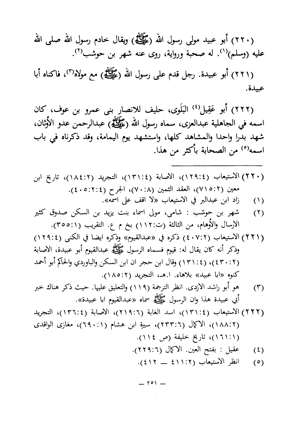 220 - الاستيعاب (4: 129)، الإصابة (4: 131)، التجريد (2: 184)، تاريخ ابن معين (2: 715)، العقد الثمين (8: 70)، الجرح (4: 2: 405).
