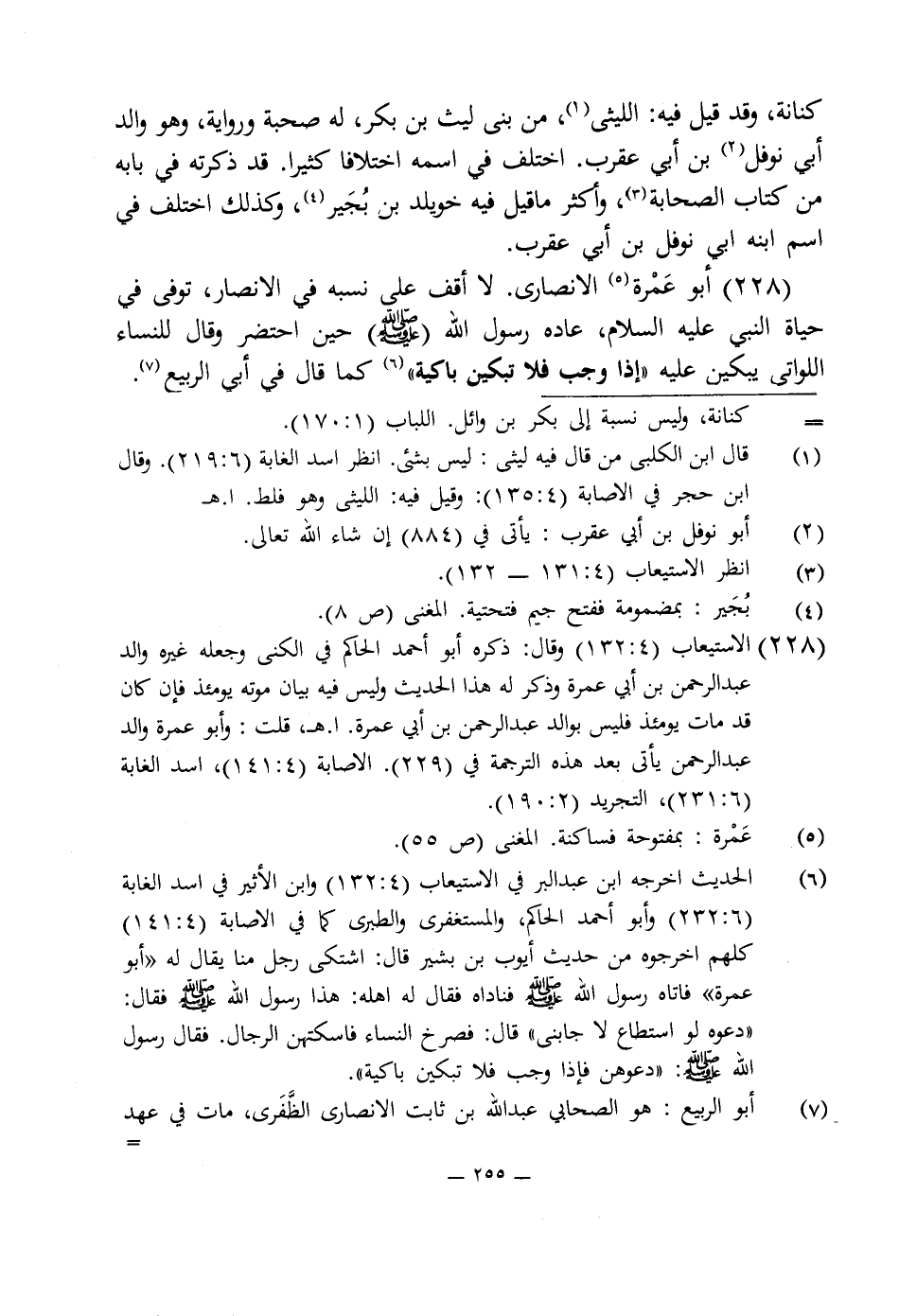 228 - أبو عَمْرة (¬5) الأنصارى. لا أقف على نسبه في الأنصار، توفى في حياة النبى عليه السلام، عاده رسول اللَّه (صلى اللَّه عليه وسلم) حين احتضر وقال للنساء اللواتى يبكين عليه "إذا وجب فلا تبكين باكية" (¬6) كما قال في أبى الربيع (¬7).