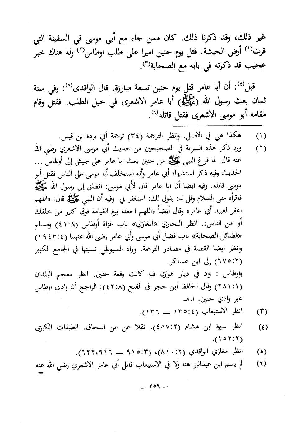 (¬2) ورد ذكر هذه السرية في الصحيحين من حديث أبى موسى الاشعرى رضى اللَّه عنه قال: لما فرغ النبى -صلى اللَّه عليه وسلم- من حنين بعث أبا عامر على جيش إلى أوطاس. . . الحديث وفيه ذكر استشهاد أبى عامر وأنه استخلف أبا موسى على الناس فقتل أبو موسى قاتله. وفيه أيضا أن أبا عامر قال لأبى موسى: انطلق إلى رسول اللَّه -صلى اللَّه عليه وسلم- فاقرأه منى السلام وقل له: يقول لك: استغفر لى. وفيه أن النبى -صلى اللَّه عليه وسلم- قال: "اللهم اغفر لعبيد أبى عامر" وقال أيضًا "اللهم اجعله يوم القيامة فوق كثير من خلقك أو من الناس". انظر البخارى "المغازى" باب غزاة أوطاس (8: 41) ومسلم "فضائل الصحابة" باب فضل أبى موسى وأبى عامر رضى اللَّه عنهما (4: 1943) وانظر أيضا القصة في مصادر الترجمة. وزاد السيوطى نسبتها في الجامع الكبير (2: 675) إلى ابن عساكر.