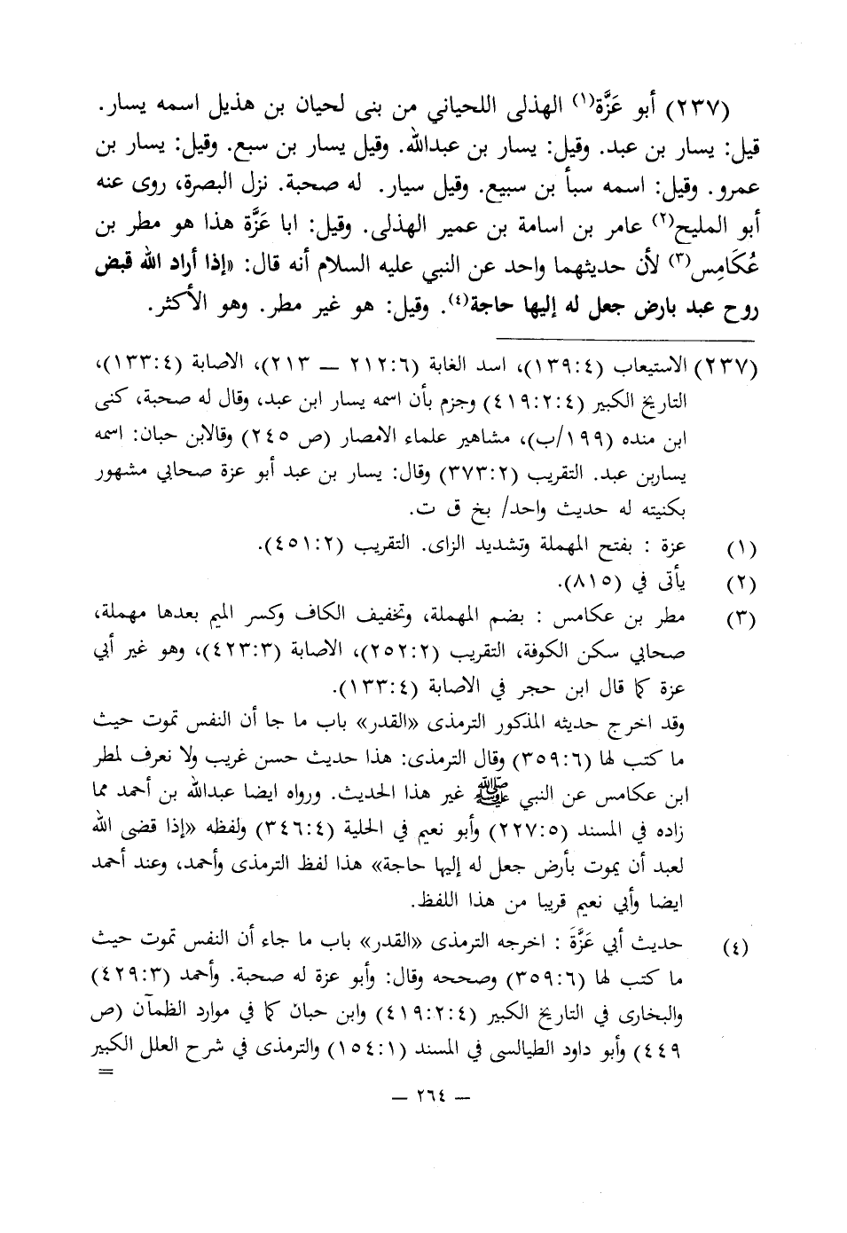 237 - أبو عَزَّة (¬1) الهذلى اللحيانى من بنى لحيان بن هذيل اسمه يسار. قيل: يسار بن عبد. وقيل: يسار بن عبد اللَّه. وقيل يسار بن سبع. وقيل: يسار بن عمرو. وقيل: اسمه سبأ بن سبيع. وقيل سيار. له صحبة. نزل البصرة، روى عنه أبو المليح (¬2) عامر بن اسامة بن عمير الهذلى. وقيل: أبا عَزَّة هذا هو مطر بن عُكَامِس (¬3) لأن حديثهما واحد عن النبى عليه السلام أنه قال: "إذا أراد اللَّه قبض روح عبد بارض جعل له إليها حاجة (¬4). وقيل: هو غير مطر. وهو الأكثر.