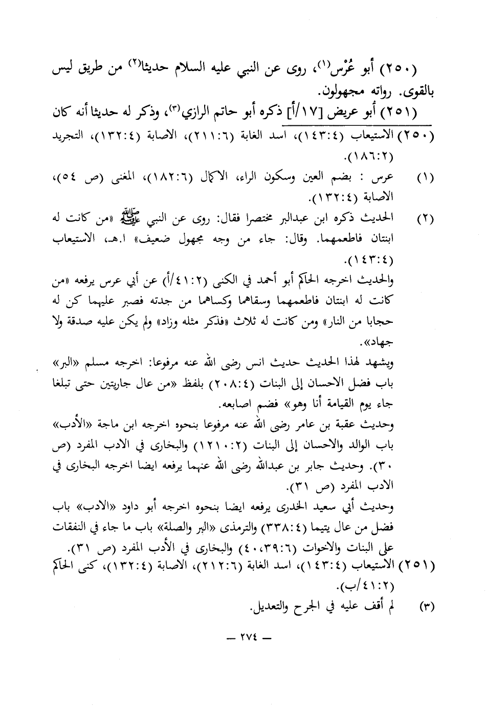 وحديث عقبة بن عامر رضى اللَّه عنه مرفوعا بنحو أخرجه ابن ماجة "الأدب" باب الوالد والاحسان إلى البنات (2: 1210) والبخارى في الادب المفرد (ص 30). وحديث جابر بن عبد اللَّه رضى اللَّه عنهما يرفعه أيضا أخرجه البخارى في الادب المفرد (ص 31).
