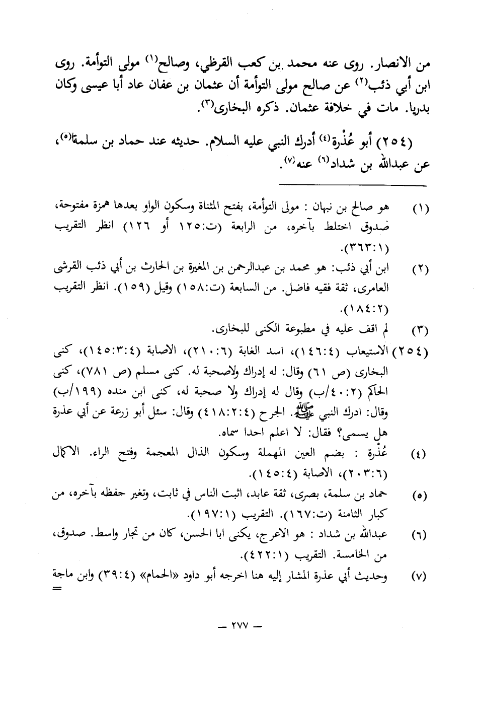 254 - الاستيعاب (4: 146)، أسد الغابة (6: 210)، الإصابة (4: 3: 145)، كنى البخارى (ص 61) وقال: له إدراك ولا صحبة له. كنى مسلم (ص 781)، كنى الحاكم (2: 40/ ب) وقال له إدراك ولا صحبة له، كنى ابن منده (199/ ب) وقال: ادرك النبى -صلى اللَّه عليه وسلم-. الجرح (4: 2: 418) وقال: سئل أبو زرعة عن أبى عذرة هل يسمى؟ فقال: لا اعلم احدا سماه.
