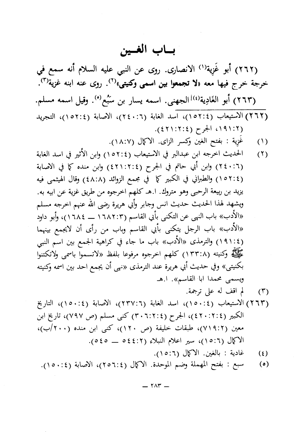 262 - أبو غَزِية (¬1) الأنصارى. روى عن النبى عليه السلام أنه سمع في خرجة خرج فيها معه "لا تجمعوا بين اسمى كنيتى" (¬2). روى عنه ابنه غزية (¬3).
