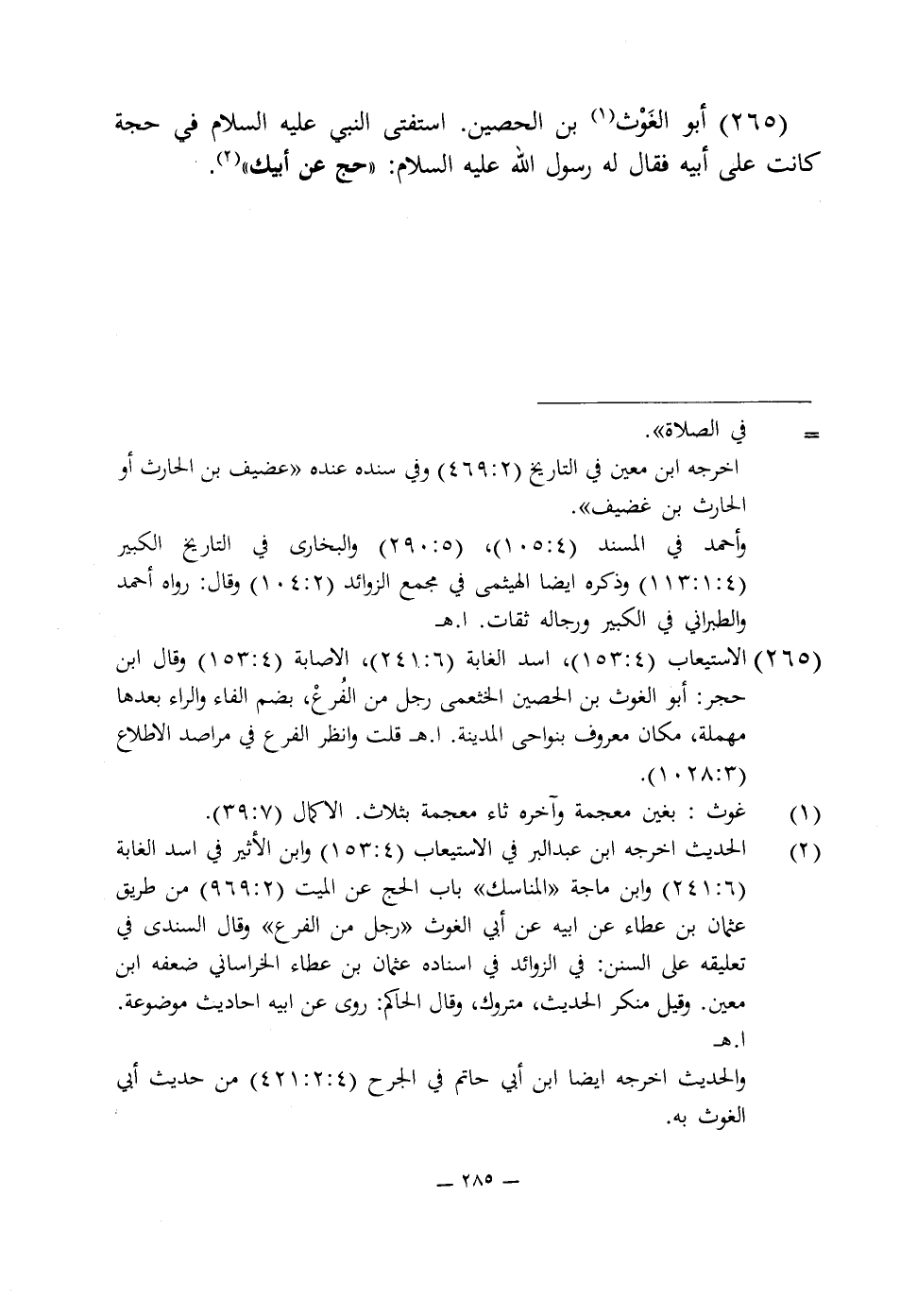 265 - الاستيعاب (4: 153)، أسد الغابة (6: 241)، الإصابة (4: 153) وقال ابن حجر: أبو الغوث بن الحصين الخثعمى رجل من الفُرعْ، بضم الفاء والراء بعدها مهملة، مكان معروف بنواحى المدينة. ا. هـ قلت وانظر الفرع في مراصد الاطلاع (3: 1028).