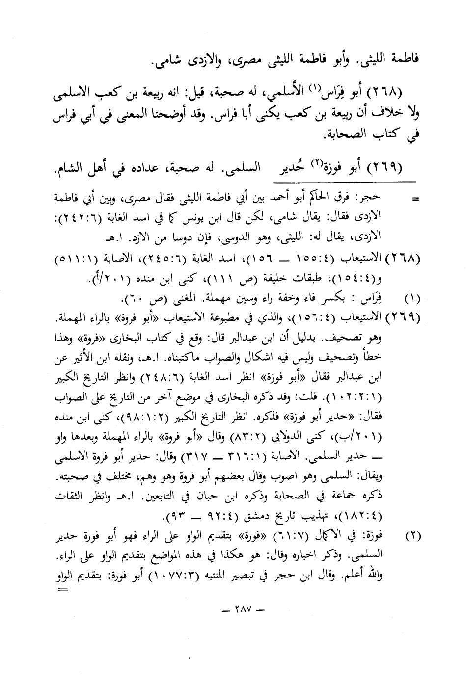 268 - أبو فِرَاس (¬1) الأسلمى، له صحبة، قيل: انه ربيعة بن كعب الأسلمى ولا خلاف أن ربيعة بن كعب يكنى أبا فراس. وقد أوضحنا المعنى في أبى فراس في كتاب الصحابة.