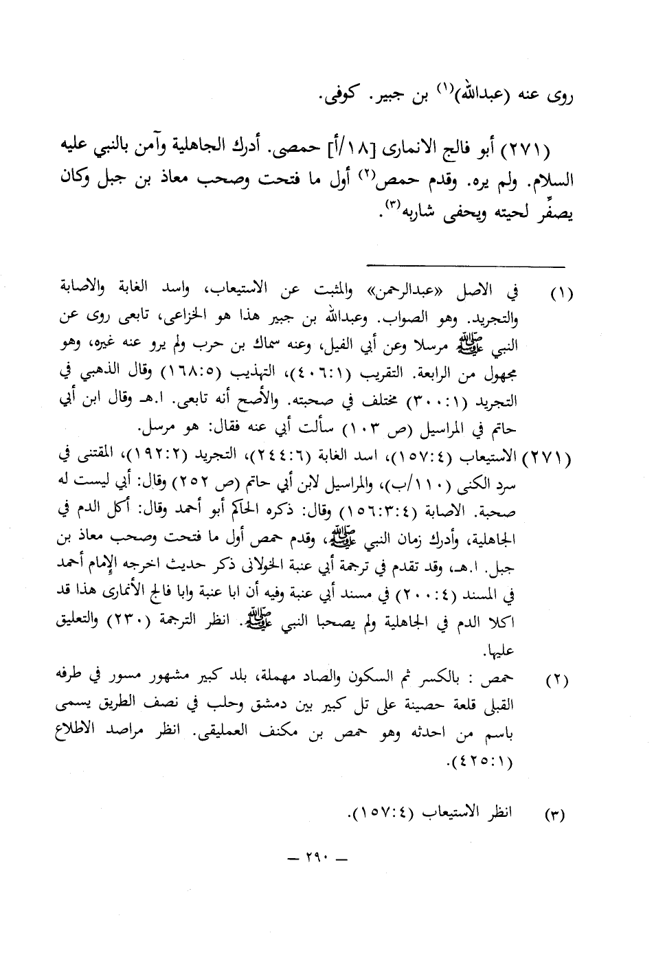 271 - أبو فالج الانمارى حمصى. أدرك الجاهلية وآمن بالنبى عليه السلام. ولم يره. وقدم حمص (¬2) أول ما فتحت وصحب معاذ بن جبل وكان يصفِّر لحيته ويحفى شاربه (¬3).