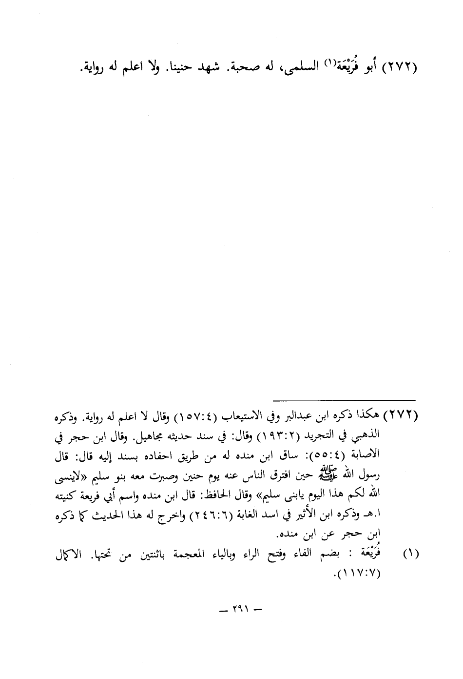 272 - هكذا ذكره ابن عبد البر وفى الاستيعاب (4: 157) وقال لا اعلم له رواية. وذكره الذهبى في التجريد (2: 193) وقال: في سند حديثه مجاهيل. وقال ابن حجر في الإصابة (4: 55): ساق ابن منده له من طريق احفاده بسند إليه قال: قال رسول اللَّه -صلى اللَّه عليه وسلم- حين افترق الناس عنه يوم حنين وصبرت معه بنو سليم "لا ينسى اللَّه لكم هذا اليوم يا بنى سليم" وقال الحافظ: قال ابن منده واسم أبى فريعة كنيته ا. هـ وذكره ابن الأثير في أسد الغابة (6: 246) وأخرج له هذا الحديث كما ذكره ابن حجر عن ابن منده.