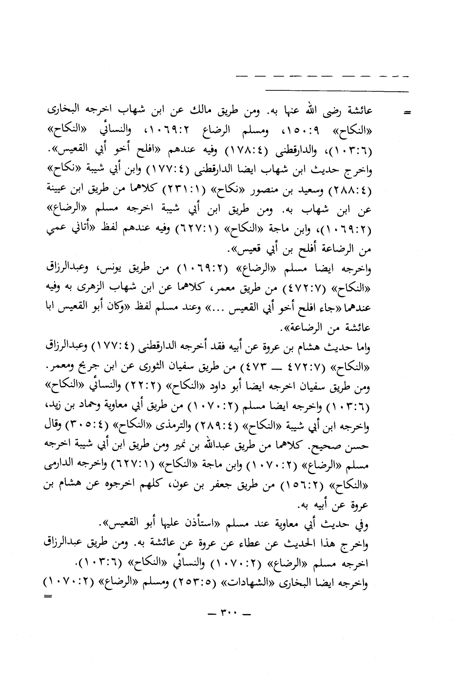 وأما حديث هشام بن عروة عن أبيه فقد أخرجه الدارقطنى (4: 177) وعبد الرزاق "النكاح" (7: 472 - 473) من طريق سفيان الثورى عن ابن جرج ومعمر. ومن طريق سفيان أخرجه أيضا أبو داود "النكاح" (2: 22) والنسائى "النكاح" (6: 103) وأخرجه أيضا مسلم (2: 1070) من طريق أبى معاوية وحماد بن زيد، وأخرجه ابن أبى شيبة "النكاح" (4: 289) والترمذى "النكاح" (4: 305) وقال حسن صحيح. كلاهما من طريق عبد اللَّه بن نمير ومن طريق ابن أبى شيبة أخرجه مسلم "الرضاع" (2: 1070) وابن ماجة "النكاح" (1: 627) وأخرجه الدارمى "النكاح" (2: 156) من طريق جعفر بن عون، كلهم أخرجوه عن هشام بن عروة عن أبيه به.