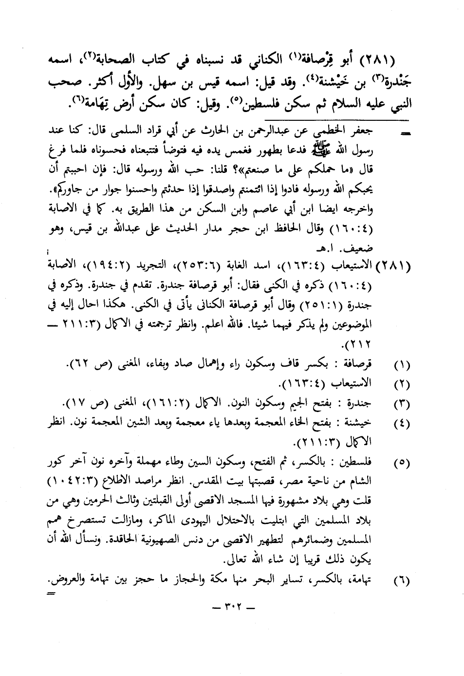 281 - الاستيعاب (4: 163)، أسد الغابة (6: 253)، التجريد (2: 194)، الإصابة (4: 160) ذكره في الكنى فقال: أبو قرصافة جندرة. تقدم في جندرة. وذكره في جندرة (1: 251) وقال أبو قرصافة الكنانى يأتى في الكنى. هكذا احال إليه في الموضوعين ولم يذكر فيهما شيئا. فاللَّه اعلم. وانظر ترجمته في الاكمال (3: 211 - 212).
