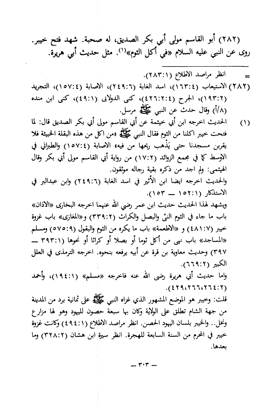 282 - أبو القاسم مولى أبى بكر الصديق، له صحبة. شهد فتح خيبر. روى عن النبى عليه السلام "في أكل الثوم" (¬1). مثل حديث أبى هريرة.