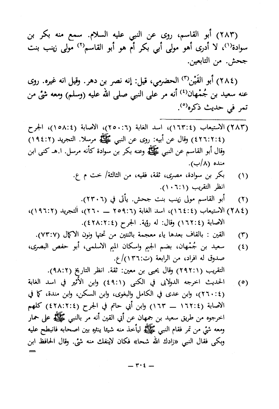 283 - الاستيعاب (4: 163)، أسد الغابة (6: 250)، الإصابة (4: 158)، الجرح (4: 2: 426) وقال عن أبيه: روى عن النبى -صلى اللَّه عليه وسلم- مرسلًا. التجريد (2: 194) وقال أبو القاسم عن النبى -صلى اللَّه عليه وسلم- وعنه بكر بن سوادة كأنه مرسل. ا. هـ كنى ابن منده (8/ ب).