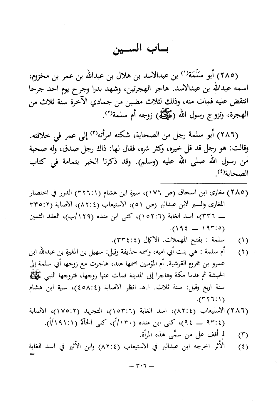 285 - أبو سَلَمَة (¬1) بن عبد الاسد بن هلال بن عبد اللَّه بن عمر بن مخزوم، اسمه عبد اللَّه بن عبد الاسد. هاجر الهجرتين، وشهد بدرا وجرح يوم أحد جرحا انتقض عليه فمات منه، وذلك لثلاث مضين من جمادى الآخرة سنة ثلاث من الهجرة، وتزوج رسول اللَّه (صلى اللَّه عليه وسلم) زوجه أم سلمة (¬2).