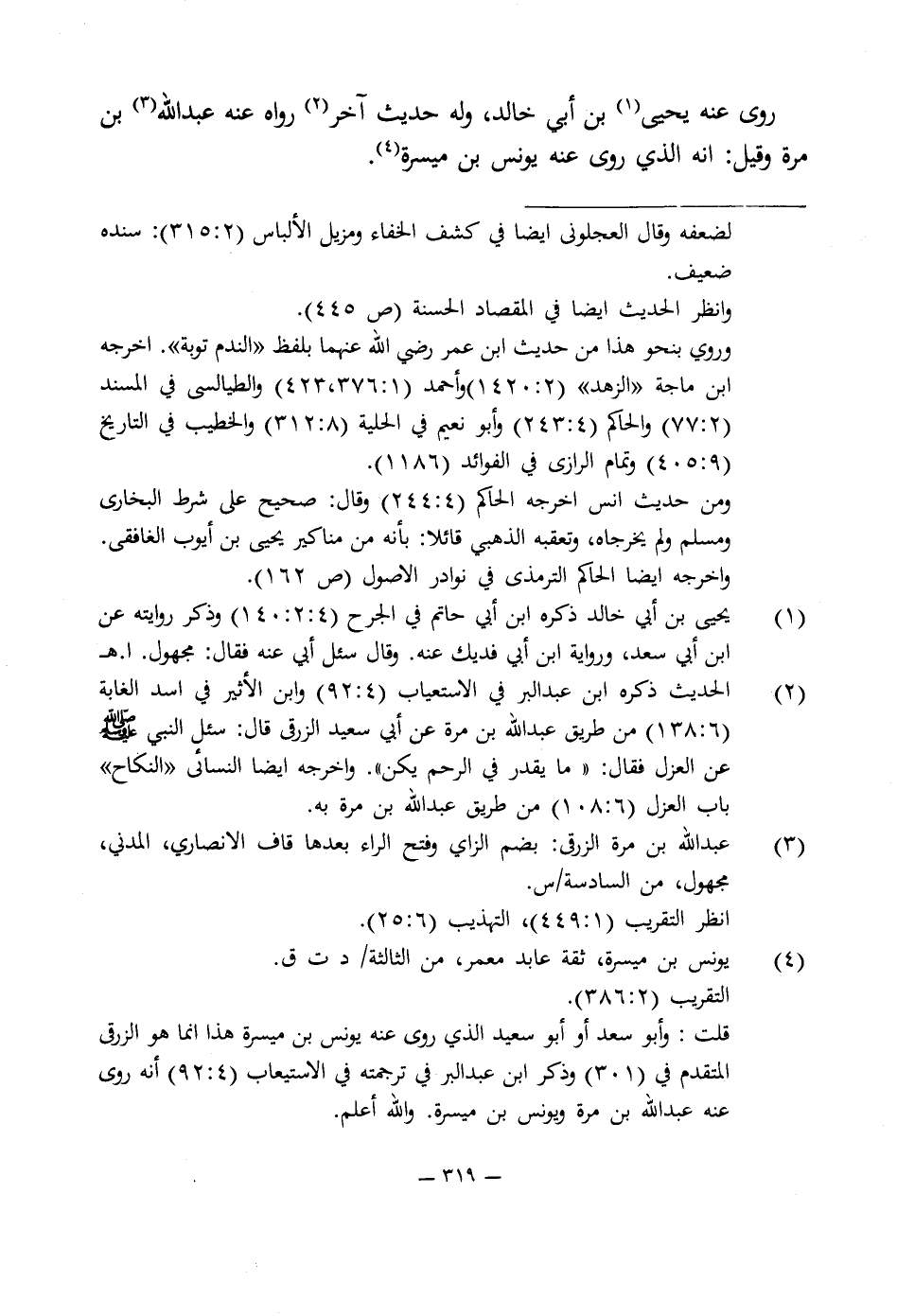 (¬1) يحيى بن أبى خالد ذكره ابن أبى حاتم في الجرح (4: 2: 140) وذكر روايته عن ابن أبى سعد، ورواية ابن أبى فديك عنه. وقال سئل أبى عنه فقال: مجهول. ا. هـ