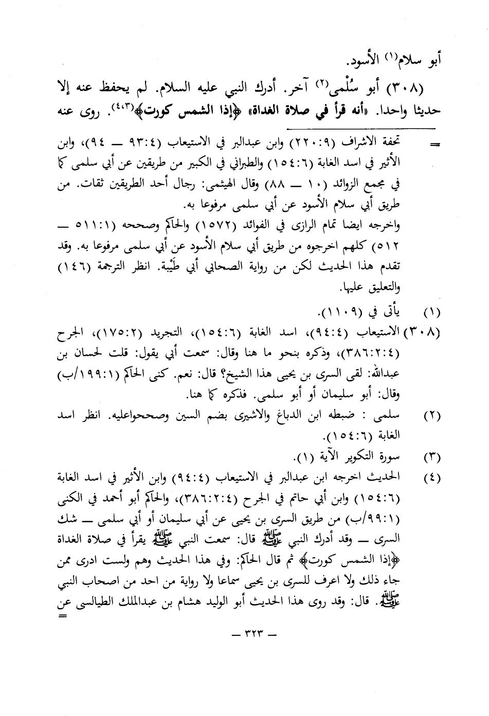 (¬4) الحديث أخرجه ابن عبد البر في الاستيعاب (4: 94) وابن الأثير في أسد الغابة (6: 154) وابن أبى حاتم في الجرح (4: 2: 386)، والحاكم أبو أحمد في الكنى (1: 99/ ب) من طريق السرى بن يحيى عن أبى سليمان أو أبى سلمى -شك السرى- وقد أدرك النبى -صلى اللَّه عليه وسلم- قال: سمعت النبى -صلى اللَّه عليه وسلم- يقرأ في صلاة الغداة {إِذَا الشَّمْسُ كُوِّرَتْ} ثم قال الحاكم: وفى هذا الحديث وهم ولست ادرى ممن جاء ذلك ولا اعرف للسرى بن يحيى سماعا ولا رواية من أحد من أصحاب النبى -صلى اللَّه عليه وسلم-. قال: وقد روى هذا الحديث أبو الوليد هشام بن عبد الملك الطيالسى عن =