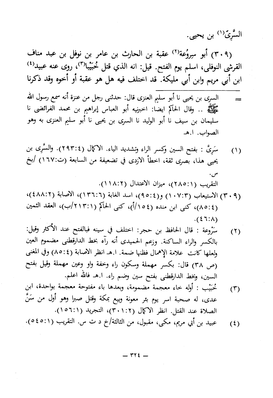 (¬3) خُبَيْب: أوله خاء معجمة مضمومة, وبعدها باء مفتوحة معجمة بواحدة، ابن على، له صحبة اسر يوم بئر معونة وبيع بمكة وقتل صبرا وهو أول من سَنَّ الصلاة عند القتل. انظر الاكمال (2: 301)، التجريد (1: 156).