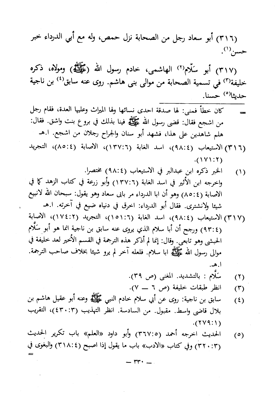317 - الاستيعاب (4: 98)، أسد الغابة (6: 151)، التجريد (2: 174)، الإصابة (4: 93) ورجح أن أبا سلام الذى يروى عنه سابق بن ناجية إنما هو أبو سَلَّام الحبشى وهو تابعى. وقال: إنما لم أذكر هذه الترجمة في القسم الأخير لعد خليفة في موالى رسول اللَّه -صلى اللَّه عليه وسلم- أبا سلام. فلعله آخر لم يرو شيئًا بخلاف صاحب الترجمة. ا. هـ.