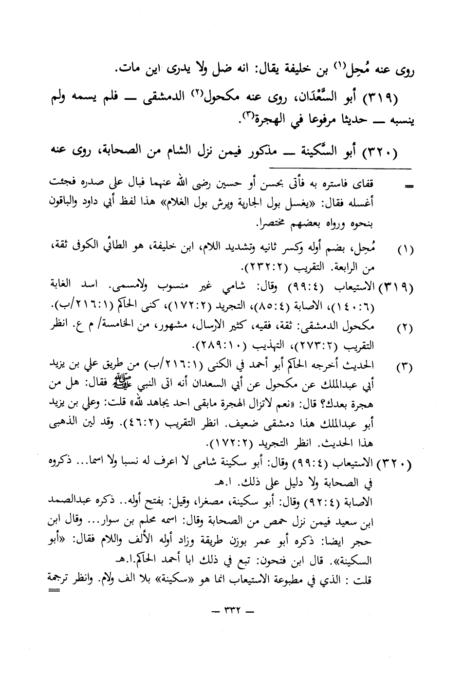 319 - الاستيعاب (4: 99) وقال: شامى غير منسوب ولا مسمى. أسد الغابة (6: 140)، الإصابة (4: 85)، التجريد (2: 172)، كنى الحاكم (1: 216/ ب).