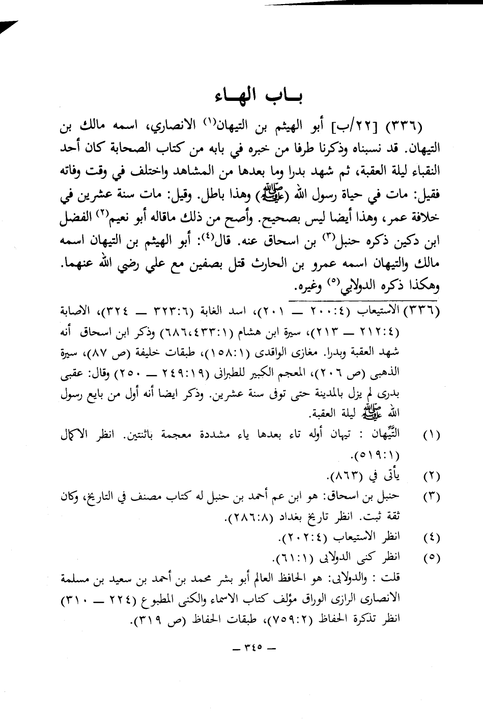 336 - أبو الهيثم بن التيهان (¬1) الأنصارى، اسمه مالك بن التيهان. قد نسبناه وذكرنا طرفا من خبره في بابه من كتاب الصحابة كان أحد النقباء ليلة العقبة، ثم شهد بدرا وما بعدها من المشاهد واختلف في وقت وفاته فقيل: مات في حياة رسول اللَّه (صلى اللَّه عليه وسلم) وهذا باطل. وقيل: مات سنة عشرين في خلافة عمر، وهذا أيضًا ليس بصحيح. وأصح من ذلك ما قاله أبو نعيم (¬2) الفضل ابن دكين ذكره حنبل (¬3) بن إسحاق عنه. قال (¬4): أبو الهيثم بن التيهان اسمه مالك والتيهان اسمه عمرو بن الحارث قتل بصفين مع على رضى اللَّه عنهما. وهكذا ذكره الدولابى (¬5) وغيره.