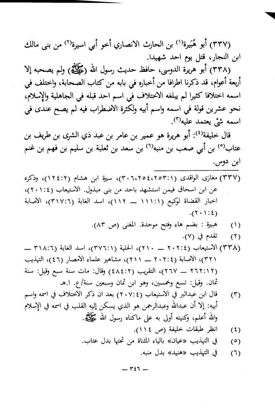 (¬3) قال ابن عبد البر في الاستيعاب (4: 207) بعد ان ذكر الاختلاف في اسمه واسم أبيه: إلا أن عبد اللَّه وعبد الرحمن هو الذى يسكن إليه القلب في اسمه في الإسلام واللَّه أعلم، كنيته أولى به على ما كناه رسول اللَّه -صلى اللَّه عليه وسلم-.