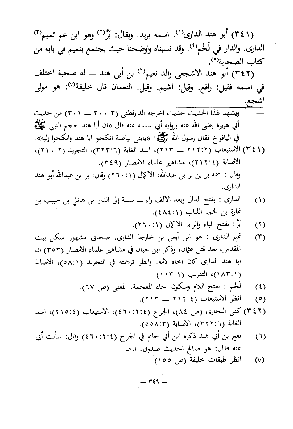 (¬3) تميم الدارمى: هو ابن أوس بن خارجة الدارمى، صحابى مشهور سكن بيت المقدس، بعد قتل عثمان، وذكر ابن حبان في مشاهير علماء الأمصار (353) ان أبا هند الدارمى كان أخاه لأمه. وانظر ترجمته في التجريد (1: 58)، الإصابة (1: 183)، التقريب (1: 113).