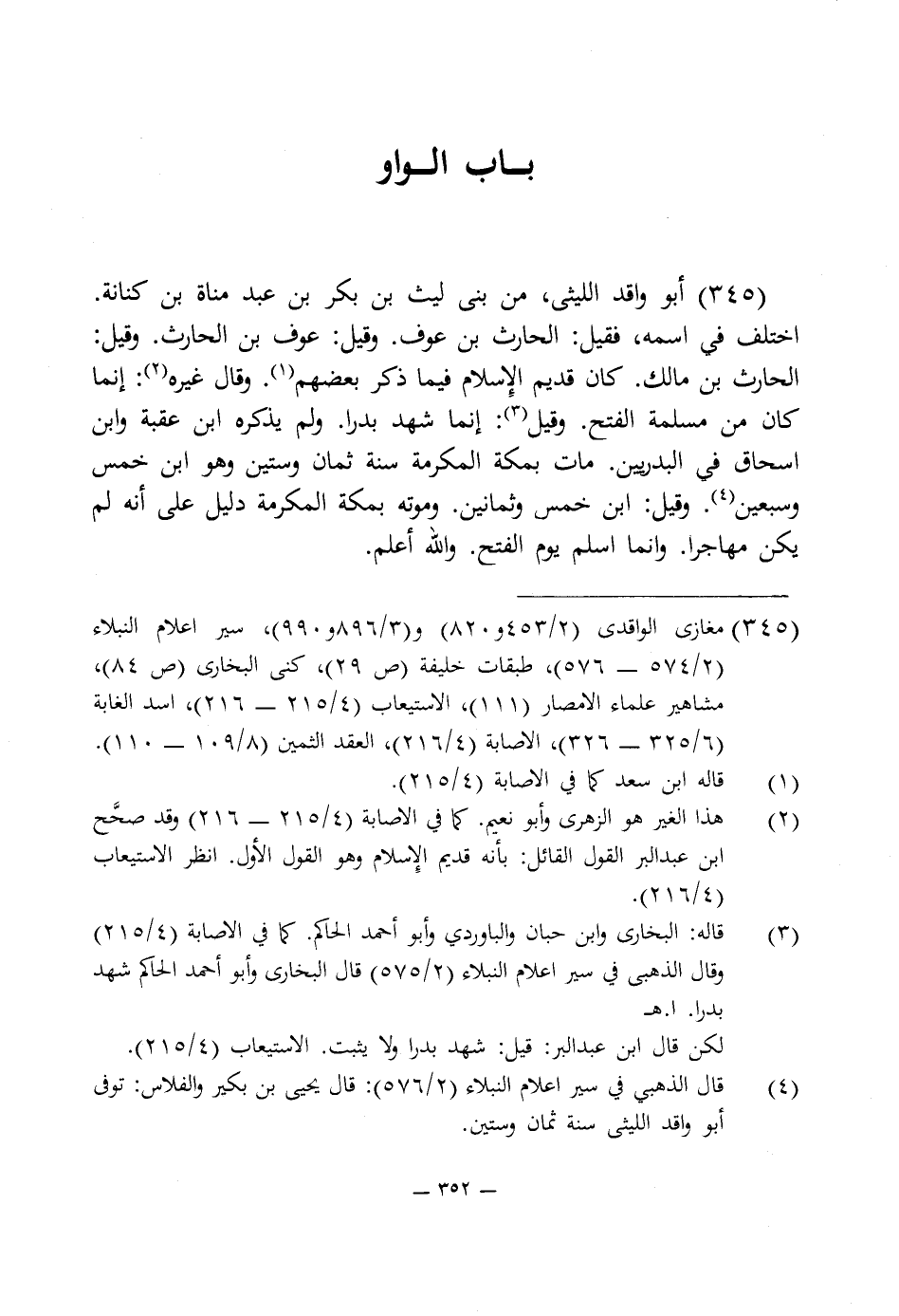345 - أبو واقد الليثى، من بنى ليث بن بكر بن عبد مناة بن كنانة. اختلف في اسمه، فقيل: الحارث بن عوف. وقيل: عوف بن الحارث. وقيل: الحارث بن مالك. كان قديم الإسلام فيما ذكر بعضهم (¬1). وقال غيره (¬2): إنما كان من مسلمة الفتح. وقيل (¬3): إنما شهد بدرا. ولم يذكره ابن عقبة وابن اسحاق في البدريين. مات بمكة المكرمة سنة ثمان وستين وهو ابن خمس وسبعين (¬4). وقيل: ابن خمس وثمانين. وموته بمكة المكرمة دليل على أنه لم يكن مهاجرا. وإنما اسلم يوم الفتح. واللَّه أعلم.