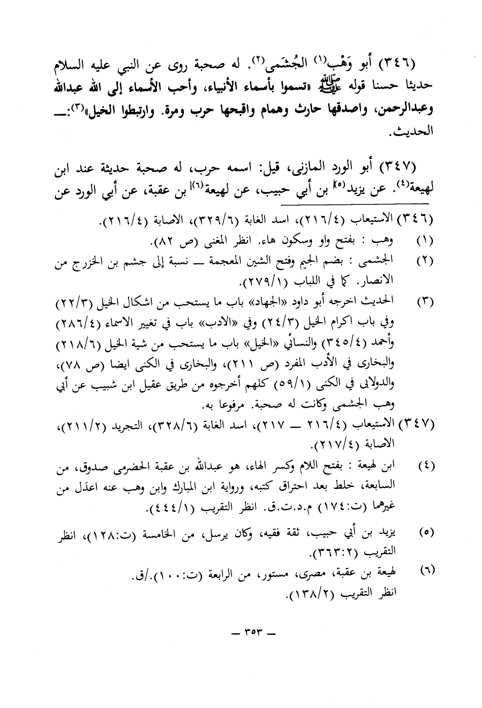 346 - أبو وَهْب (¬1) الجُشَمى (¬2). له صحبة روى عن النبى عليه السلام حديثا حسنا قوله -صلى اللَّه عليه وسلم- "تسموا بأسماء الأنبياء، وأحب الأسماء إلى اللَّه عبد اللَّه وعبد الرحمن، واصدقها حارث وهمام واقبحها حرب ومرة. وارتبطوا الخيل" (¬3): - الحديث.