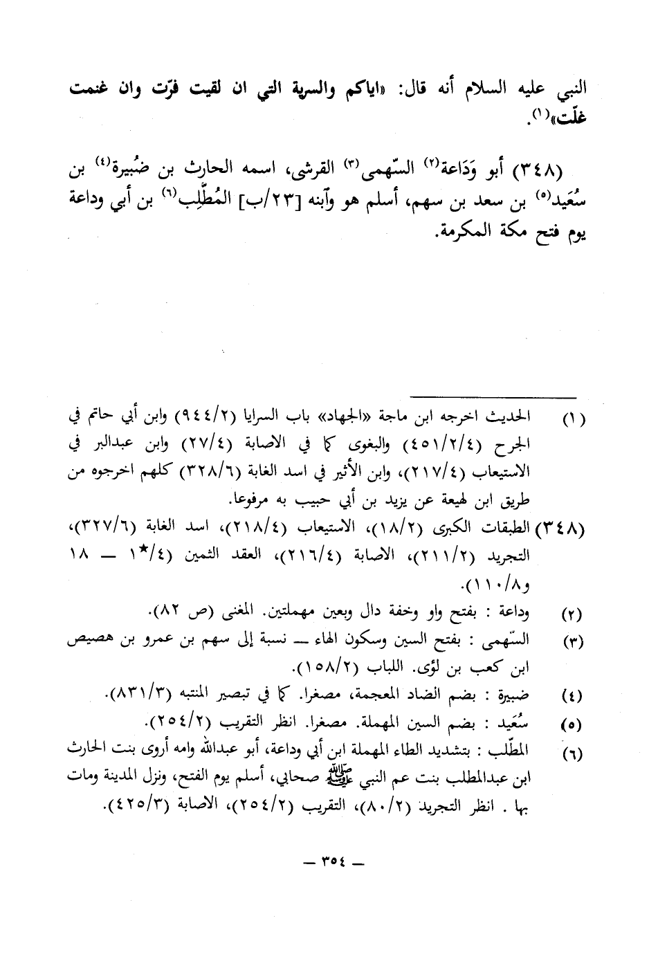 348 - أبو وَدَاعة (¬2) السّهمى (¬3) القرشى، اسمه الحارث بن ضُبيرة (¬4) بن سُعَيد (¬5) بن سعد بن سهم، أسلم هو وابنه المُطّلِب (¬6) بن أبى وداعة يوم فتح مكة المكرمة.