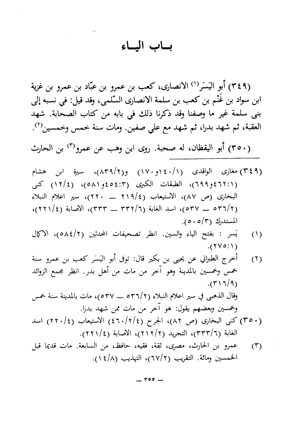 349 - أبو اليَسَر (¬1) الأنصارى، كعب بن عمرو بن عبّاد بن عمرو بن غزية ابن سواد بن غَنْم بن كعب بن سلمة الأنصارى السّلمى، وقد قيل: في نسبه إلى بنى سلمة غير ما وصفنا وقد ذكرنا ذلك في بابه من كتاب الصحابة. شهد العقبة، ثم شهد بدرا، ثم شهد مع على صفين. ومات سنة خمس وخمسين (¬2).