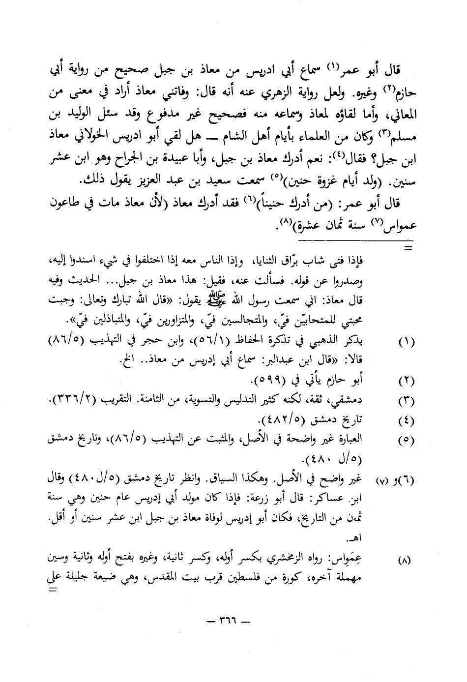 (¬6) و (¬7) غير واضح في الأصل. وهكذا السياق. وانظر تاريخ دمشق (5/ ل 480) وقال ابن عساكر: قال أبو زرعة: فإذا كان مولد أبى إدريس عام حنين وهى سنة ثمان من التاريخ، فكان أبو إدريس لوفاة معاذ بن جبل ابن عشر سنين أو أقل. اهـ.