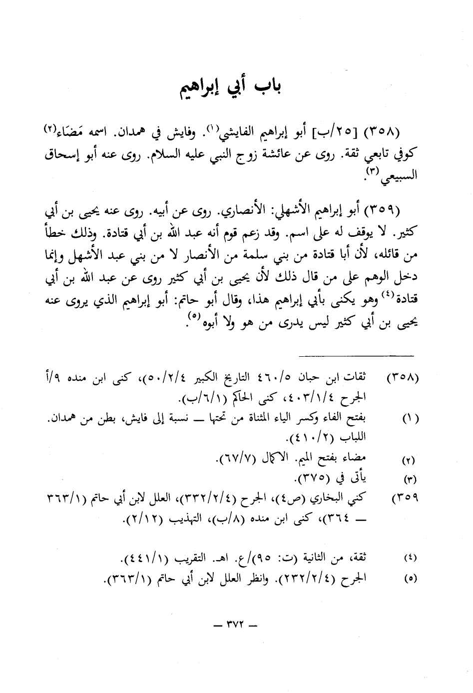 358 - أبو إبراهيم الفايشى (¬1). وفايش في همدان. اسمه مَضَاء (¬2) كوفى تابعى ثقة. روى عن عائشة زوج النبى عليه السلام. روى عنه أبو إسحاق السبيعى (¬3).