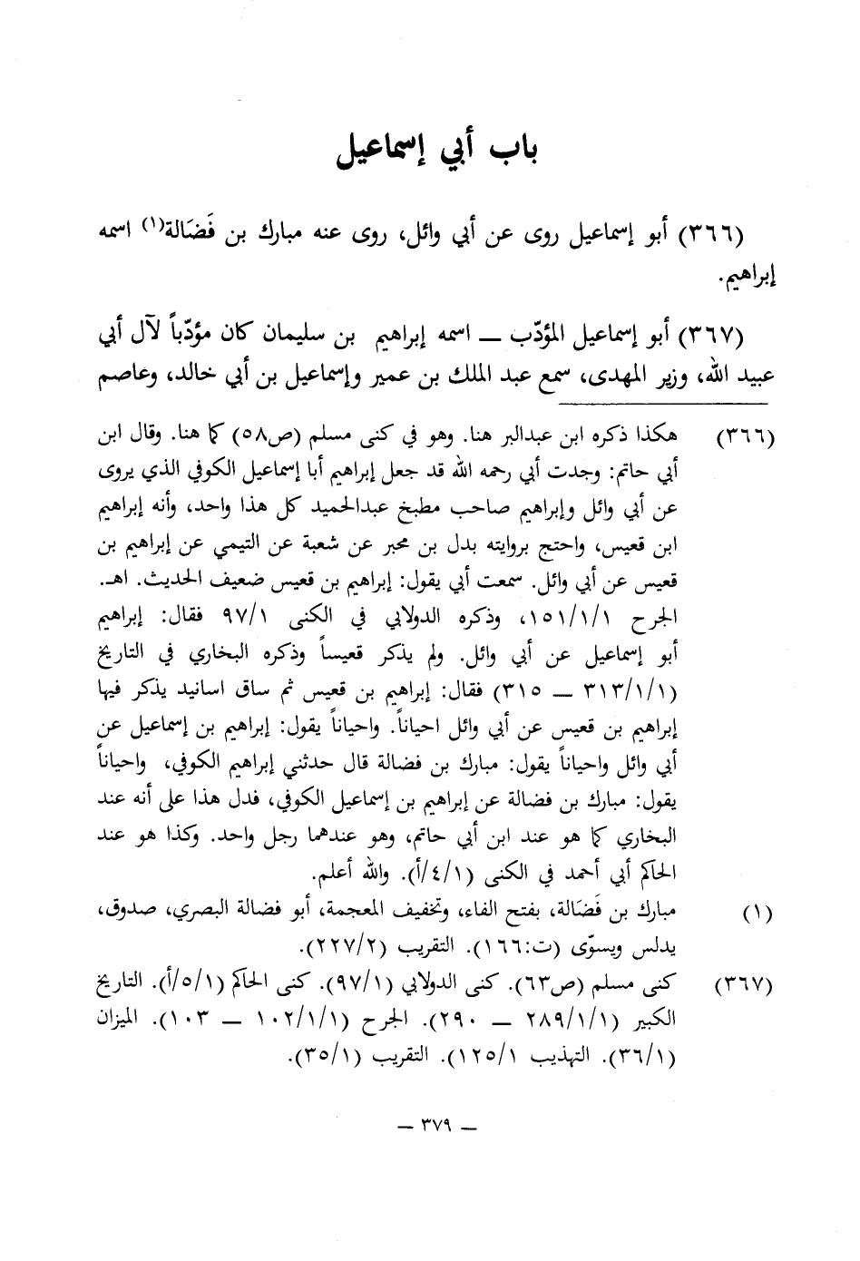 367 - أبو إسماعيل المؤدّب - اسمه إبراهيم بن سليمان كان مؤدّبًا لآل أبى عبيد اللَّه، وزير المهدى، سمع عبد الملك بن عمير وإسماعيل بن أبى خالد، وعاصم