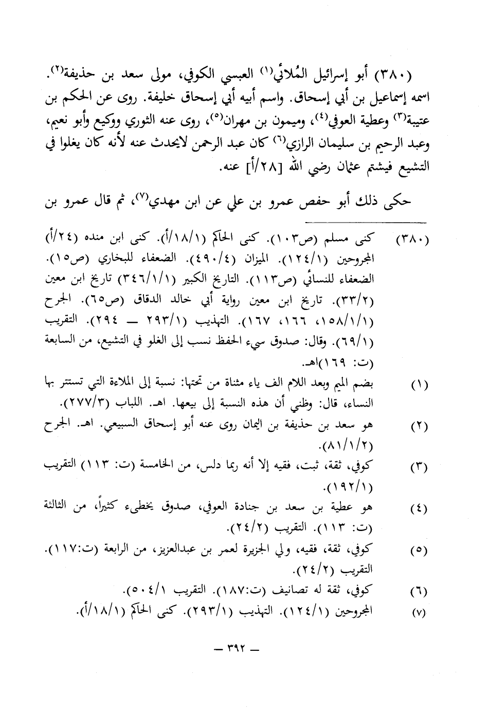 380 - كنى مسلم (ص 103). كنى الحاكم (1/ 18/ أ). كنى ابن منده (24/ أ) المجروحين (1/ 124). الميزان (4/ 490). الضعفاء للبخارى (ص 15). الضعفاء للنسائى (ص 113). التاريخ الكبير (1/ 1/ 346) تاريخ ابن معين (2/ 33). تاريخ ابن معين رواية أبى خالد الدقاق (ص 65). الجرح (1/ 1/ 158، 166، 167). التهذيب (1/ 293 - 294). التقريب (1/ 69). وقال: صدوق سئ الحفظ نسب إلى الغلو في التشيع، من السابعة (ت: 169) اهـ.