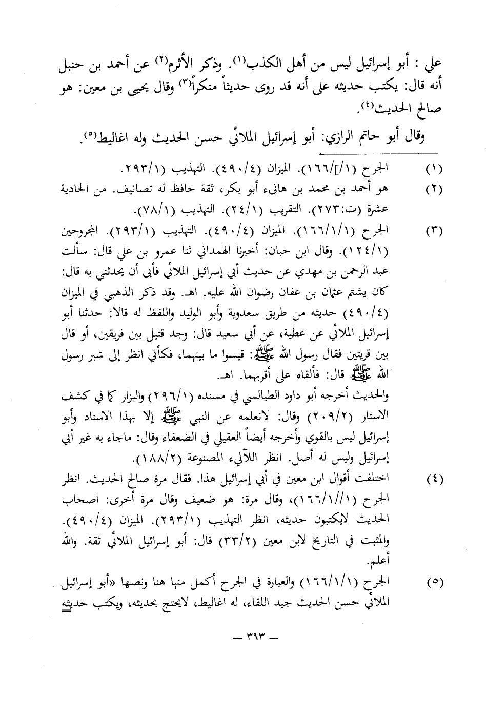 (¬5) الجرح (1/ 1/ 166) والعبارة في الجرح أكمل منها هنا ونصها "أبو إسرائيل الملائى حسن الحديث جيد اللقاء، له أغاليط، لا يحتج بحديثه، ويكتب حديثه =