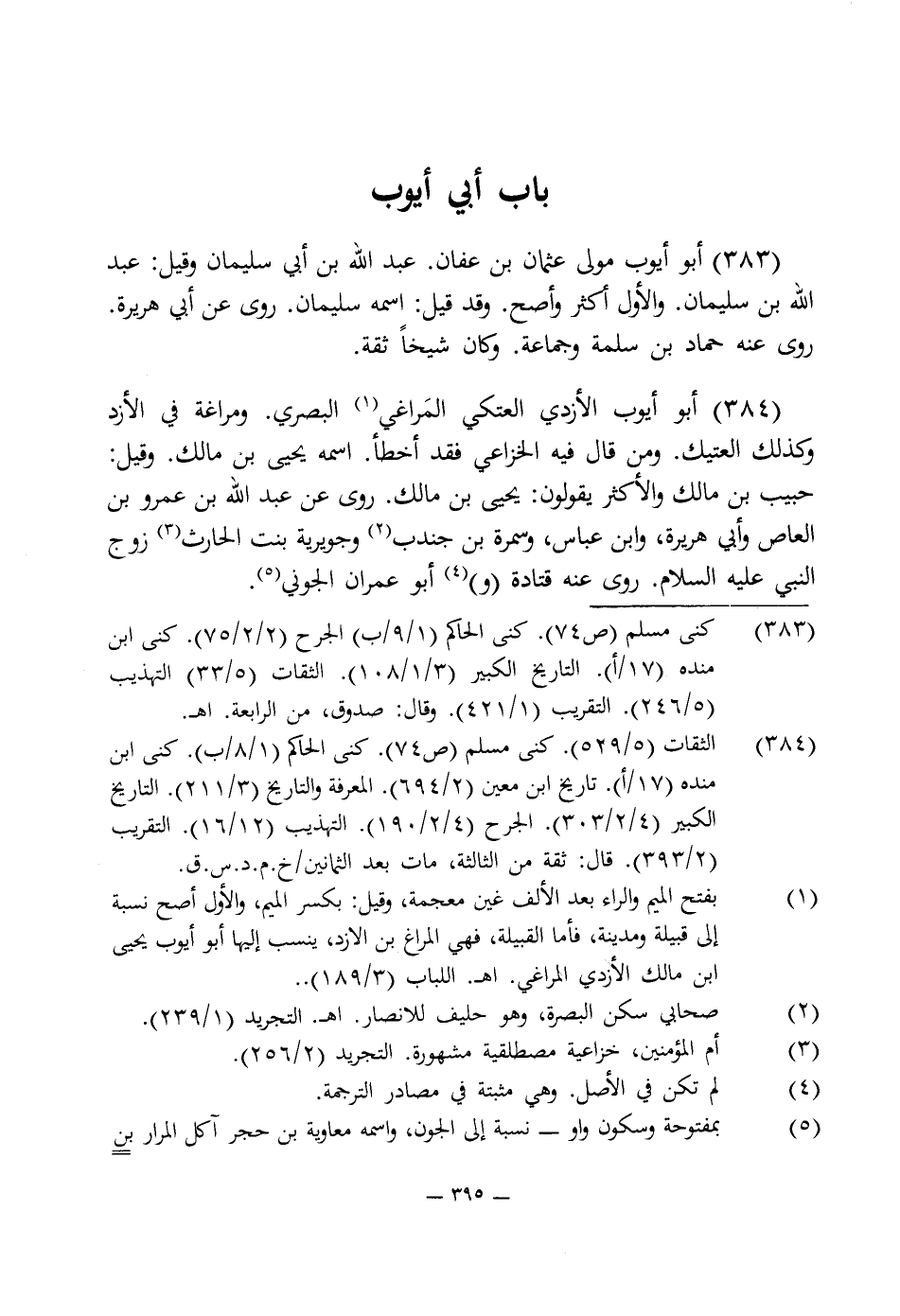 383 - كنى مسلم (ص 74). كنى الحاكم (1/ 9/ ب) الجرح (2/ 2/ 75). كنى ابن منده (17/ أ). التاريخ الكبير (3/ 1/ 108). الثقات (5/ 33) التهذيب (5/ 246). التقريب (1/ 421). وقال: صدوق، من الرابعة. اهـ.