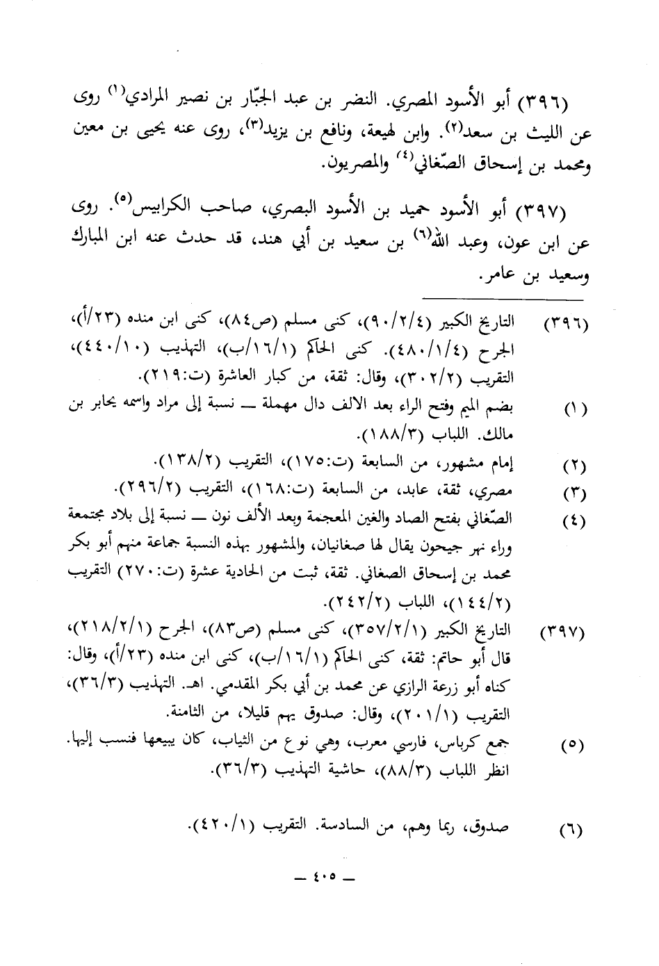 396 - أبو الأسود المصرى. النضر بن عبد الجبّار بن نصير المرادى (¬1) روى عن الليث بن سعد (¬2). وابن لهيعة، ونافع بن يزيد (¬3)، روى عنه يحيى بن معين ومحمد بن إسحاق الصّغانى (¬4) والمصريون.