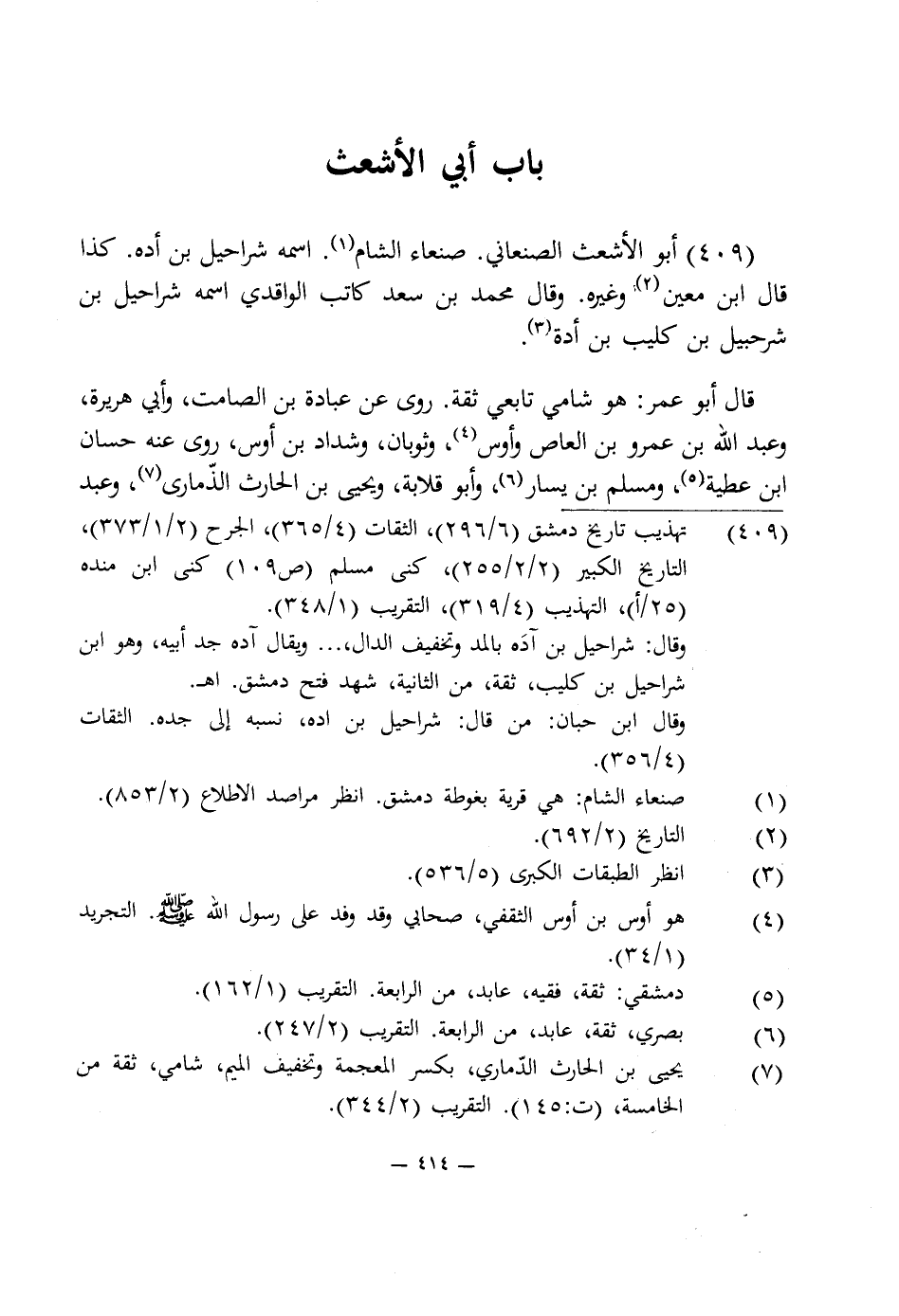 409 - أبو الأشعث الصنعانى. صنعاء الشام (¬1). اسمه شراحيل بن أده. كذا قال ابن معين (¬2) وغيره. وقال محمد بن سعد كاتب الواقدى اسمه شراحيل بن شرحبيل بن كليب بن أدة (¬3).