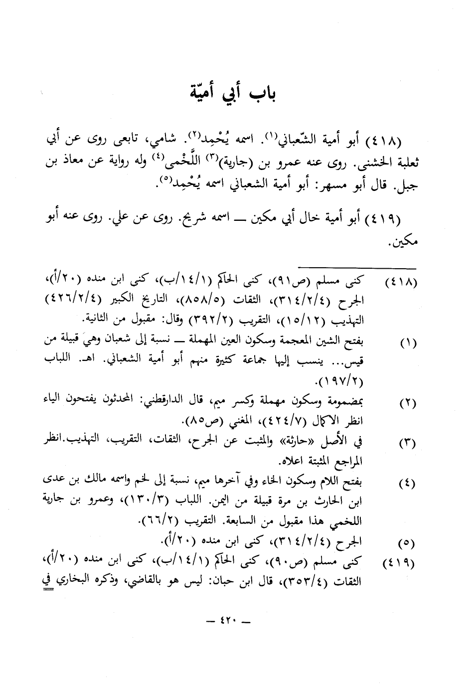 418 - أبو أمية الشّعبانى (¬1). اسمه يُحْمِد (¬2). شامى، تابعى روى عن أبى ثعلبة الخشنى. روى عنه عمرو بن (جارية) (¬3) اللَّخْمى (¬4) وله رواية عن معاذ بن جبل. قال أبو مسهر: أبو أمية الشعبانى اسمه يُحْمِد (¬5).