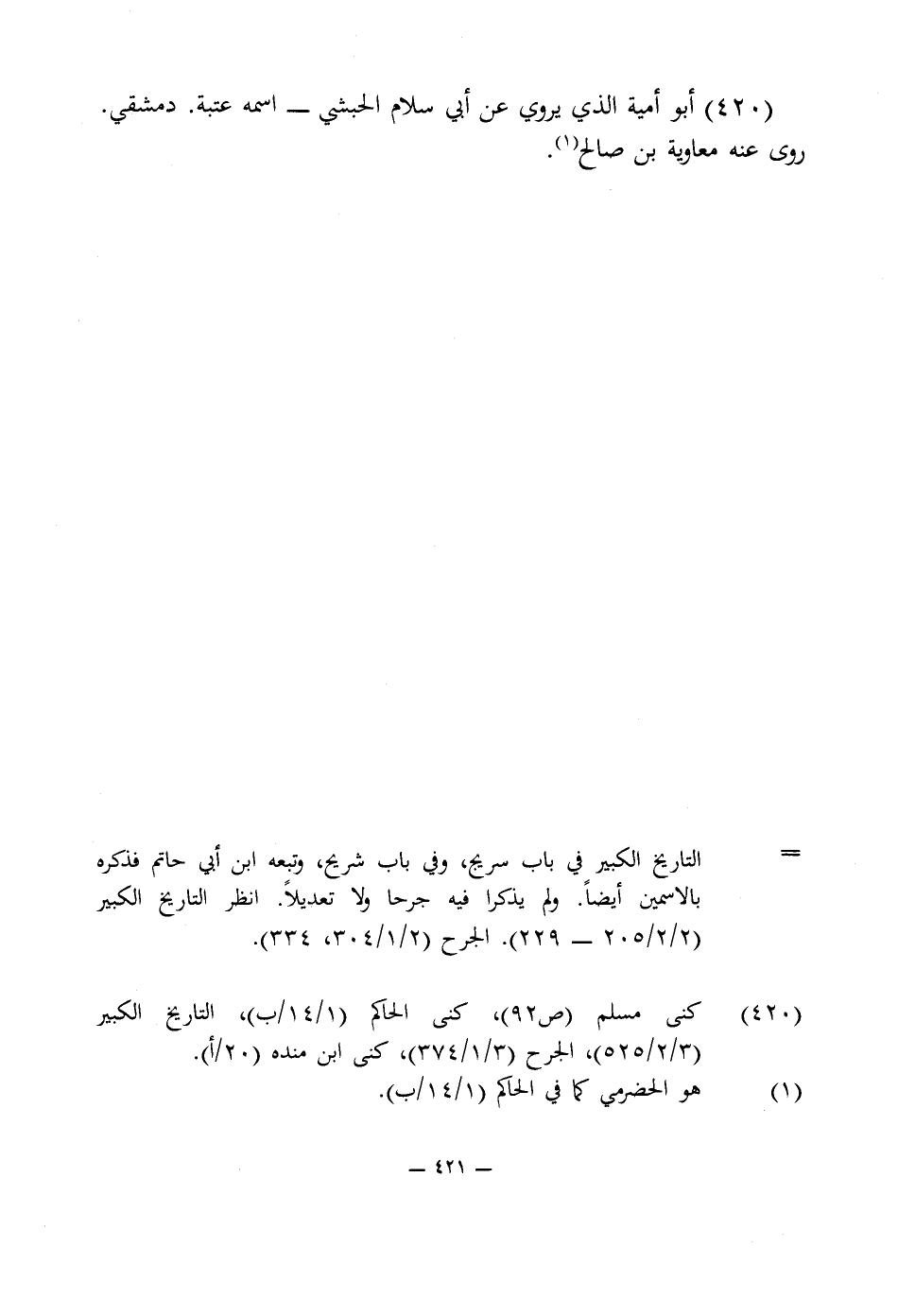 420 - أبو أمية الذى يروى عن أبى سلام الحبشى - اسمه عتبة. دمشقى. روى عنه معاوية بن صالح (¬1).