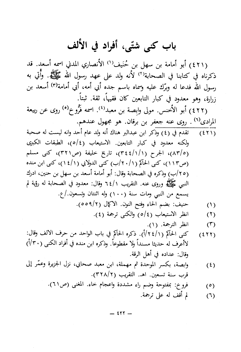 421 - تقدم في (4) وذكر ابن عبد البر هناك أنه ولد عام أحد وأنه ليست له صحبة ولكنه معدود في كبار التابعين. الاستيعاب (4/ 5)، الطبقات الكبرى (5/ 83)، الجرح (1/ 1/ 344)، تاريخ خليفة (ص 321)، كنى مسلم (ص 113)، كنى الحاكم (1/ 20/ ب) كنى الدولابى (1/ 14)، كنى ابن منده (25/ ب) وذكره في الصحابة وقال: أبو أمامة أسعد بن سهل بن حنين، أدرك النبى -صلى اللَّه عليه وسلم- وروى عنه. التقريب 1/ 64 وقال: معدود في الصحابة له رؤية لم يسمع من النبى ومات سنة (100) وله اثنتان وتسعون. ع.