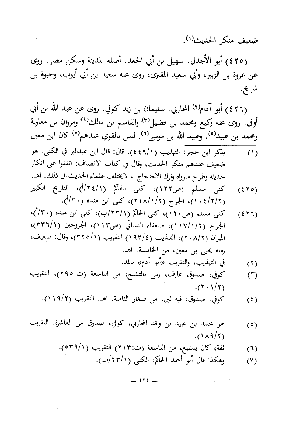 426 - كنى مسلم (ص 120)، كنى الحاكم (1/ 23/ ب)، كنى ابن منده (30/ أ)، الجرح (2/ 1/ 117)، ضعفاء النسائى (ص 113)، المجروحين (1/ 336)، الميزان (2/ 208)، التهذيب (4/ 193) التقريب (1/ 325)، وقال: ضعيف، رماه يحيى بن معين، من الخامسة. اهـ.