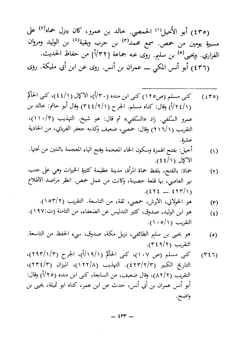 435 - كنى مسلم (ص 125) كنى ابن منده (30/ أ)، الاكمال (1/ 44)، كنى الحاكم (1/ 24/ أ) وقال: كناه مسلم. الجرح (1/ 2/ 344) وقال أبو حاتم: خالد بن عمرو السّلفى. زاد "السّلفى" ثم قال: هو شيخ. التهذيب (3/ 110)، التقريب (1/ 216) وقال: حمصى، ضعيف وكذبه جعفر الفريابى، من الحادية عشرة.