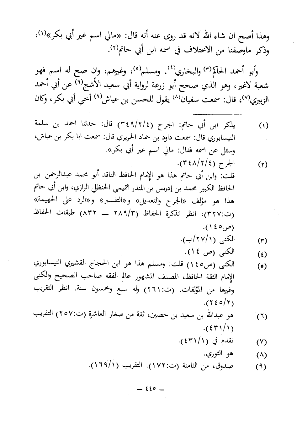 (¬5) الكنى (ص 145) قلت: ومسلم هذا هو ابن الحجاج القشيرى النيسابورى الإِمام الثقة الحافظ، المصنف المشهور عالم الفقه صاحب الصحيح والكنى وغيرها من المؤلفات. (ت: 261) وله سبع وخمسون سنة. انظر التقريب (2/ 245).