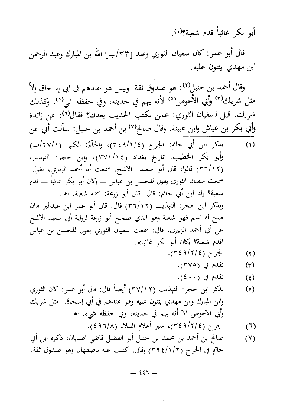 (¬1) يذكر ابن أبى حاتم: الجرح (4/ 2/ 349)، والحاكم: الكنى (27/ 1/ ب) وأبو بكر الخطيب: تاريخ بغداد (14/ 372)، وابن حجر: التهذيب (12/ 36) قالوا: قال أبو سعيد الاشج. سمعت أبا أحمد الزبيرى، يقول: سمعت سفيان الثورى يقول للحسن بن عياش -وكان أبو بكر غائبًا- قدم شعبة؟ زاد ابن أبى حاتم: قال: قال أبو زرعة: اسمه شعبة. اهـ.