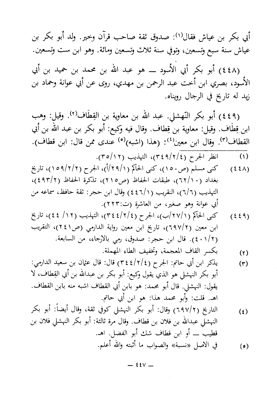 (¬3) يذكر ابن أبى حاتم: الجرح (4/ 2/ 344) قال: قال عثمان بن سعيد الدارمى: أبو بكر النهشلى هو الذى يقول وكيع: أبو بكر بن عبد اللَّه بن أبى القِطاف، لا يقول: النهشلى. قال أبو محمد: هو بابن أبى القطاف اشبه منه بابن القطاف. اهـ. قلت: وأبو محمد هذا: هو ابن أبى حاتم.