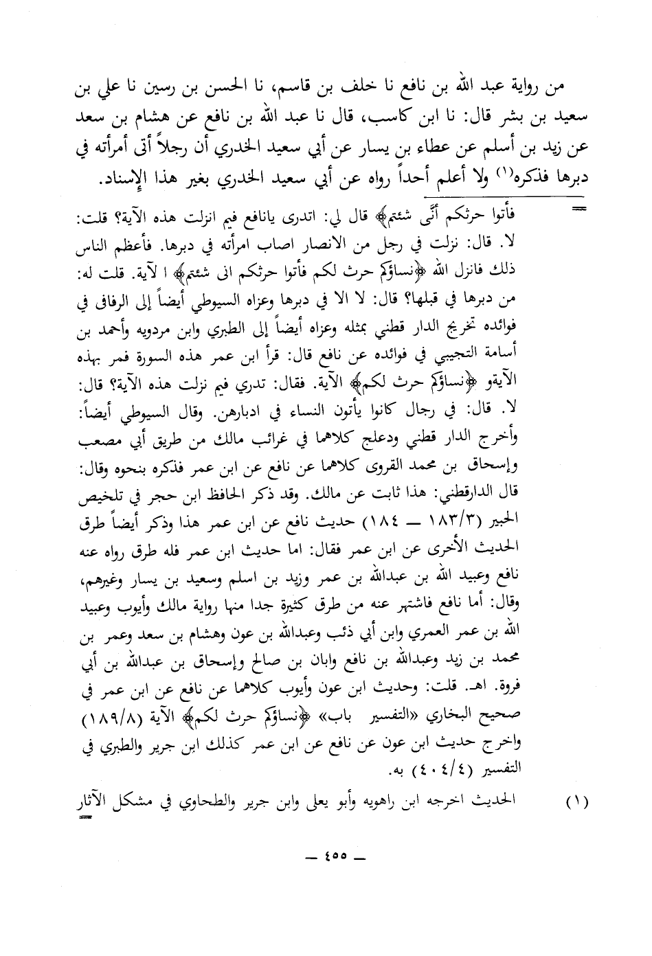 = فَأْتُوا حَرْثَكُمْ أَنَّى شِئْتُمْ} قال لى: اتدرى يا نافع فيم انزلت هذه الآية؟ قلت: لا. قال: نزلت في رجل من الأنصار أصاب امرأته في دبرها. فأعظم الناس ذلك فأنزل اللَّه {نِسَاؤُكُمْ حَرْثٌ لَكُمْ فَأْتُوا حَرْثَكُمْ أَنَّى شِئْتُمْ} الآية. قلت له: من دبرها في قبلها؟ قال: لا إلا في دبرها وعزاه السيوطى أيضًا إلى الرفافى في فوائده تخريج الدارقطنى بمثله وعزاه أيضًا إلى الطبرى وابن مردويه وأحمد بن أسامة التجيبى في فوائده عن نافع قال: قرأ ابن عمر هذه السورة فمر بهذه الآية و {نِسَاؤُكُمْ حَرْثٌ لَكُمْ} الآية. فقال: تدرى فيم نزلت هذه الآية؟ قال: لا. قال: في رجال كانوا يأتون النساء في ادبارهن. وقال السيوطى أيضًا: وأخرج الدارقطنى ودعلج كلاهما في غرائب مالك من طريق أبى مصعب وإسحاق بن محمد القروى كلاهما عن نافع عن ابن عمر فذكره بنحوه وقال: قال الدارقطنى: هذا ثابت عن مالك. وقد ذكر الحافظ ابن حجر في تلخيص الحبير (3/ 183 - 184) حديث نافع عن ابن عمر هذا وذكر أيضًا طرق الحديث الأخرى عن ابن عمر فقال: اما حديث ابن عمر فله طرق رواه عنه نافع وعبيد اللَّه بن عبد اللَّه بن عمر وزيد بن أسلم وسعيد بن يسار وغيرهم، وقال: أما نافع فاشتهر عنه من طرق كثيرة جدًا منها رواية مالك وأيوب وعبيد اللَّه بن عمر العمرى وابن أبى ذئب وعبد اللَّه بن عون وهشام بن سعد وعمر بن محمد بن زيد وعبد اللَّه بن نافع وابان بن صالح وإسحاق بن عبد اللَّه بن أبى فروة. اهـ. قلت: وحديث ابن عون وأيوب كلاهما عن نافع عن ابن عمر في صحيح البخارى "التفسير باب" {نِسَاؤُكُمْ حَرْثٌ لَكُمْ} الآية (8/ 189) وأخرج حديث ابن عون عن نافع عن ابن عمر كذلك ابن جرير والطبرى في التفسير (4/ 404) به.