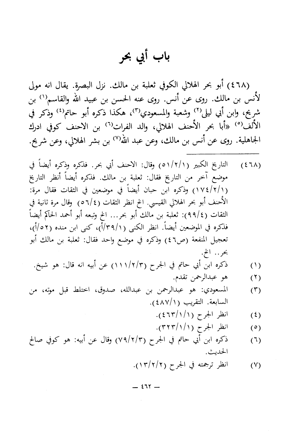 468 - التاريخ الكبير (1/ 2/ 51) وقال: الأحنف أبى بحر. فذكره وذكره أيضًا في موضع آخر من التاريخ فقال: ثعلبة بن مالك. فذكره أيضًا انظر التاريخ (1/ 2/ 174) وذكره ابن حبان أيضًا في موضعين في الثقات فقال مرة: الأحنف أبو بحر الهلالى القيسى. الخ انظر الثقات (4/ 56) وقال مرة ثانية في الثقات (4/ 99): ثعلبة بن مالك أبو بحر. . . إلخ وتبعه أبو أحمد الحاكم أيضًا فذكره في الموضعين أيضًا. انظر الكنى (1/ 39/ أ)، كنى ابن منده (52/ أ)، تعجيل المنفعة (ص 46) وذكره في موضع واحد فقال: ثعلبة بن مالك أبو بحر. . إلخ.